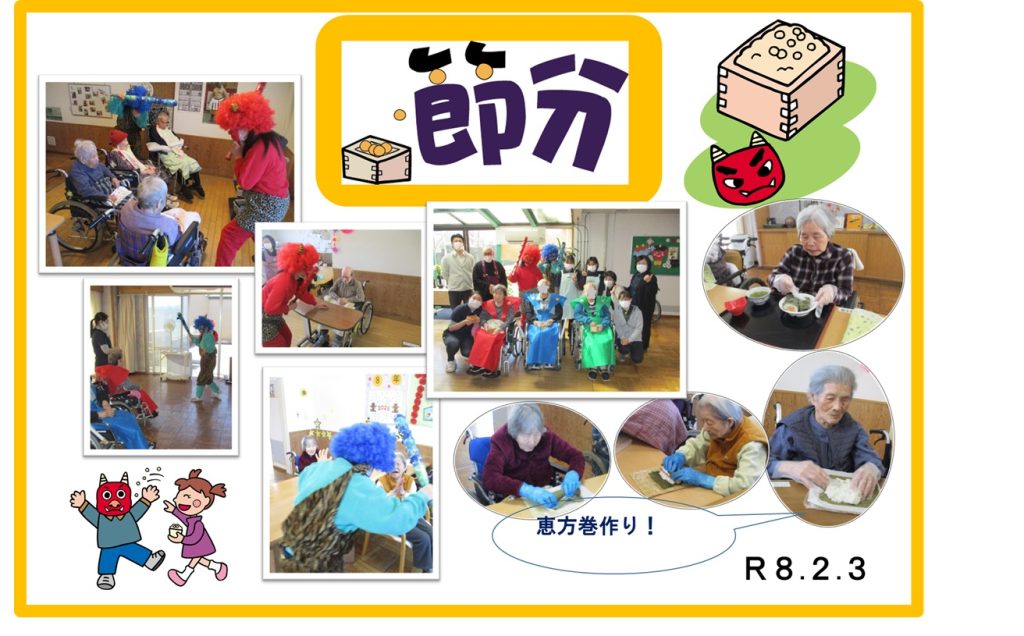 2月3日は節分。年男年女のご利用者さまや職員で豆まき、お昼は恵方巻作りを行いました。