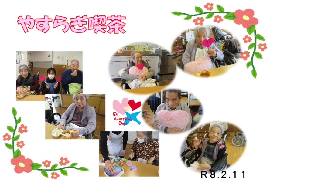 やすらぎ喫茶 コーヒーとおやつのマフィン、プリンで楽しんでいただきました バレンタインの話しやボランティアさんから頂いたハートの手芸品を飾ったりしました
